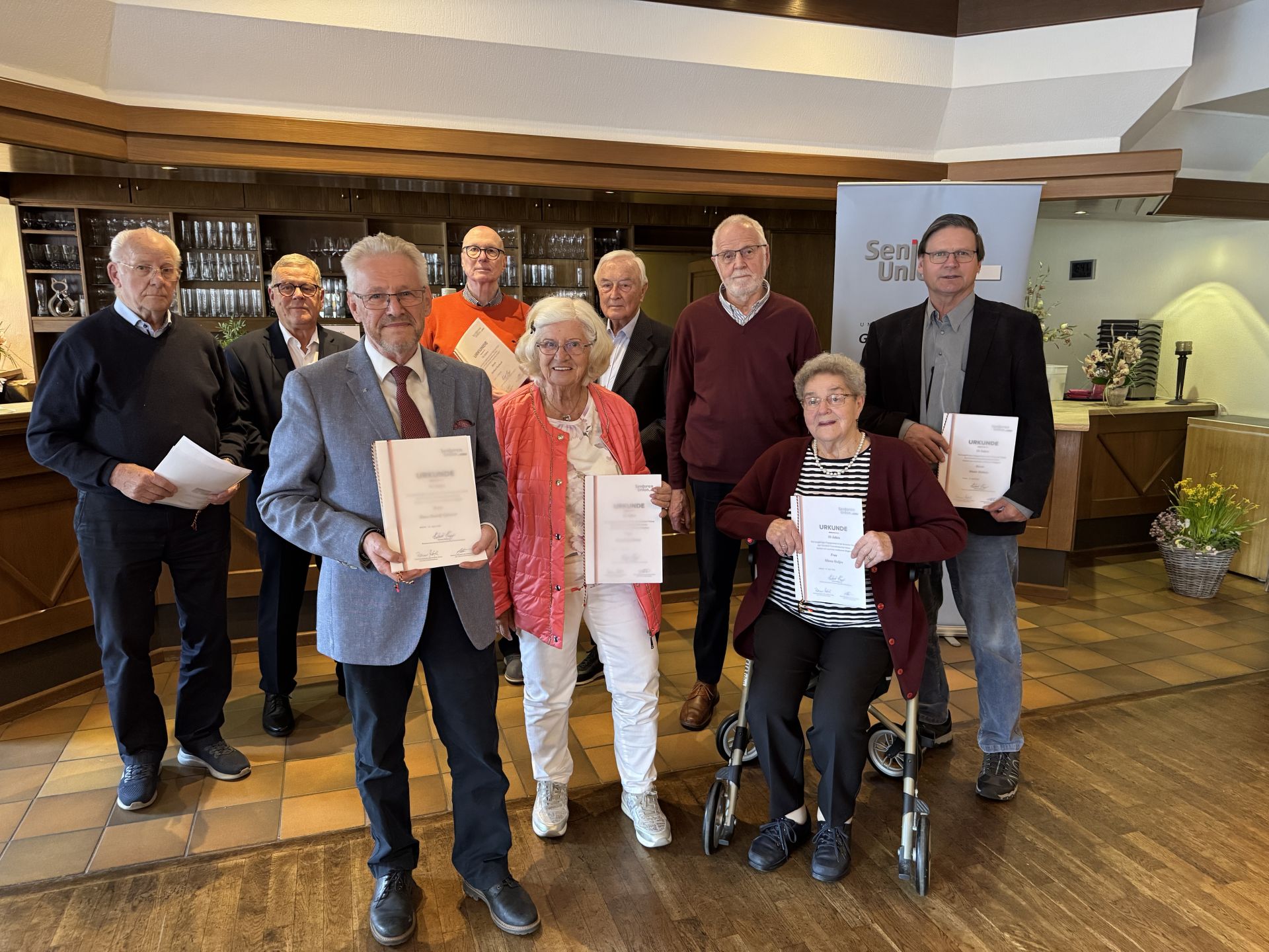 | ImRahmen der Versammlung wurden Ehrungen für langjährige Mitglieder der Senioren-Union vorgenommen. Die Ehrungen würdigten das langjährige Engagement und dieTreue der Mitglieder zur Gemeinschaſt. Besonders hervorgehoben wurden Mitglieder die seit vielen Jahren aktiv zur Senioren-Union beitragen. Die Ehrungen erfolgten durch den Vorsitzenden, der jedem Geehrten eine Urkunde sowie ein kleines Präsent überreichte. |